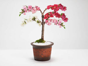 花を楽しむ品種の桃です。実はなりませんが、豪華な紅・白・桃色、2色から3色の花が咲く楽しい花盆栽です。