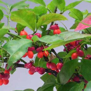 コマユミは錦木(ニシキギ)との中間種で落葉低木です。秋に代表的な紅葉が美しいもみじにも負けないくらいの綺麗な紅葉で見応えがある盆栽です。実が付くのは難しいところもありますが年数がたつにつれて繊細でかわいい実を付けてくれますので成長を楽しめます。