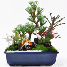 松と竹(笹)は1年中の緑を楽しめます。梅は2月頃に花を咲かせます。季節に応じて松竹梅の他に縁起物の山野草を植え込みます。苔や岩、置き物などで鉢の上に日本庭園をつくりだしています。