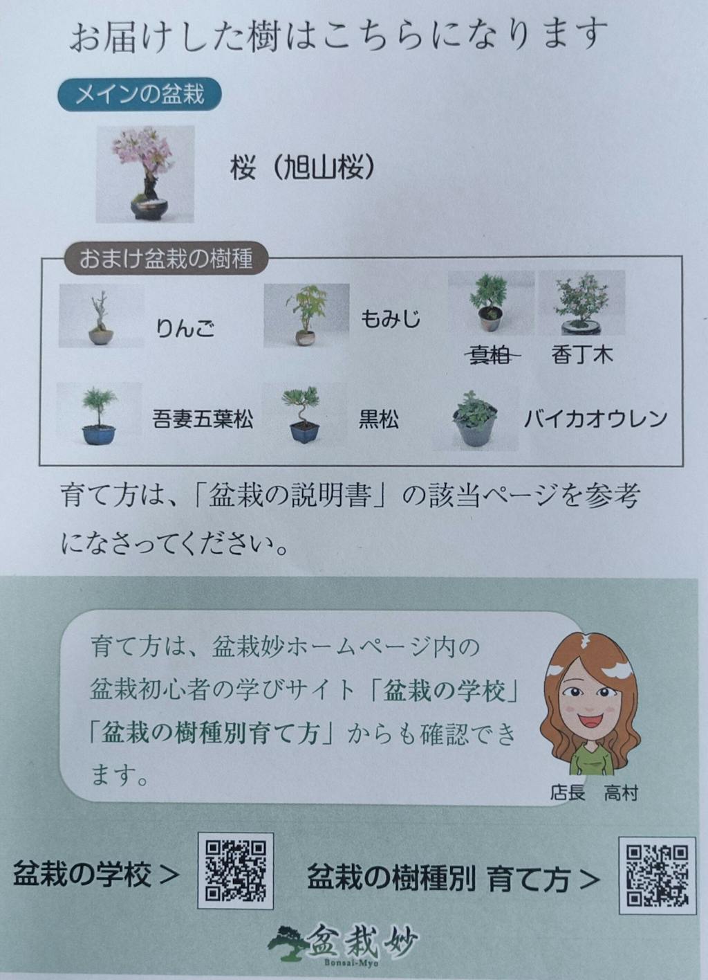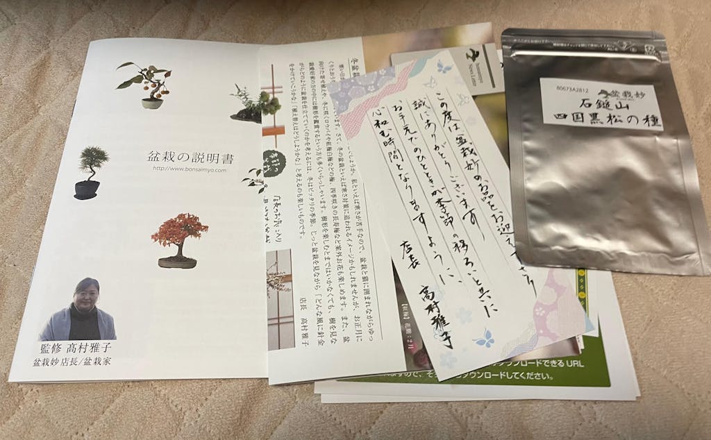 初心者のため、全般的な説明のほかに、購入した盆栽のお世話の仕方について簡単な紙などが同封されていると、さらにありがたいと思いました。