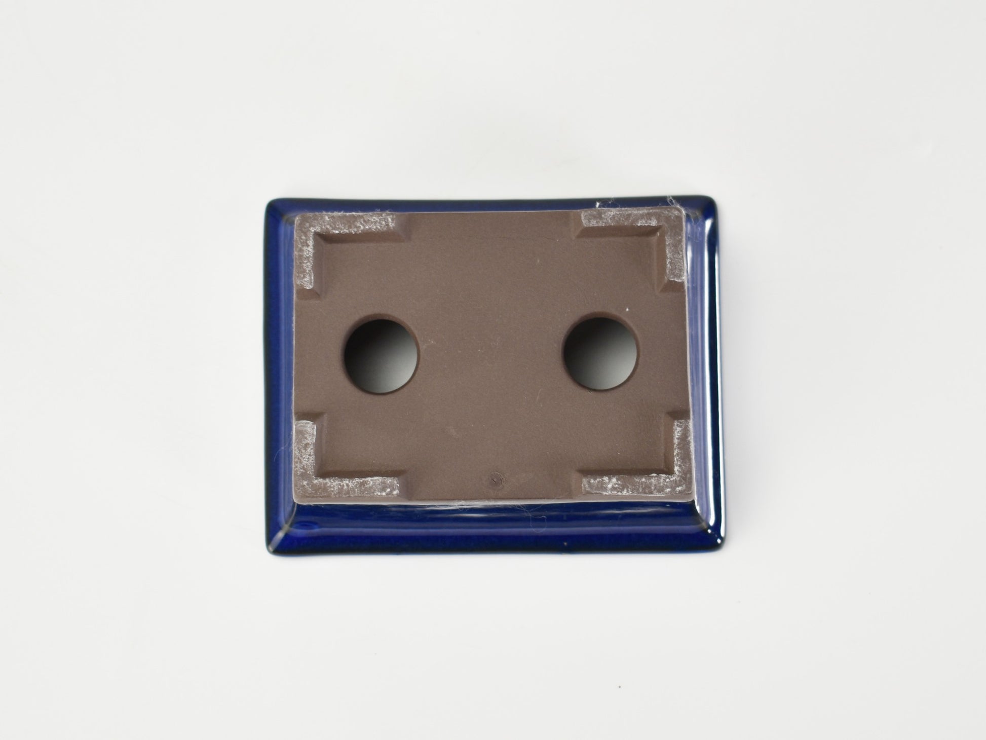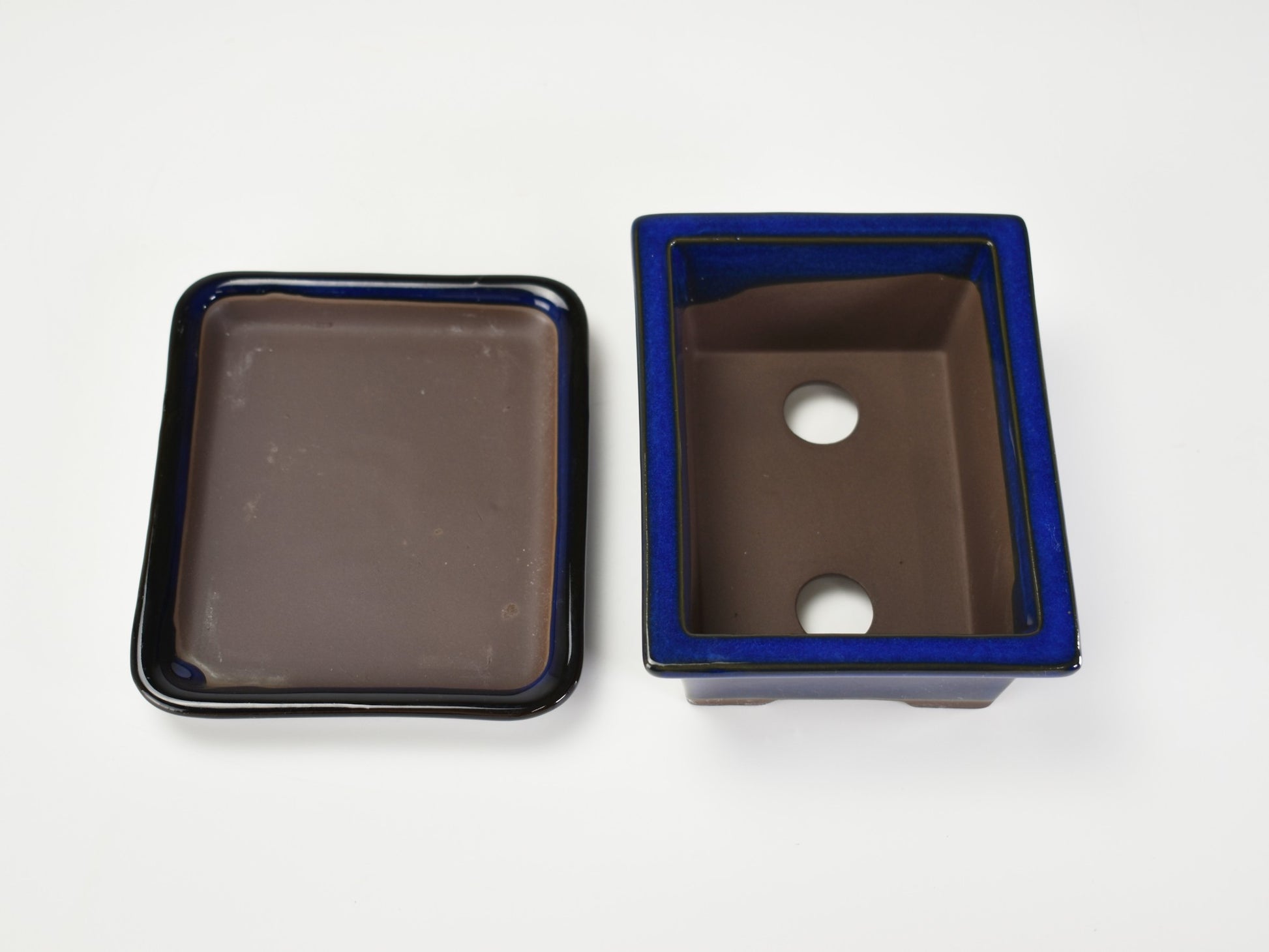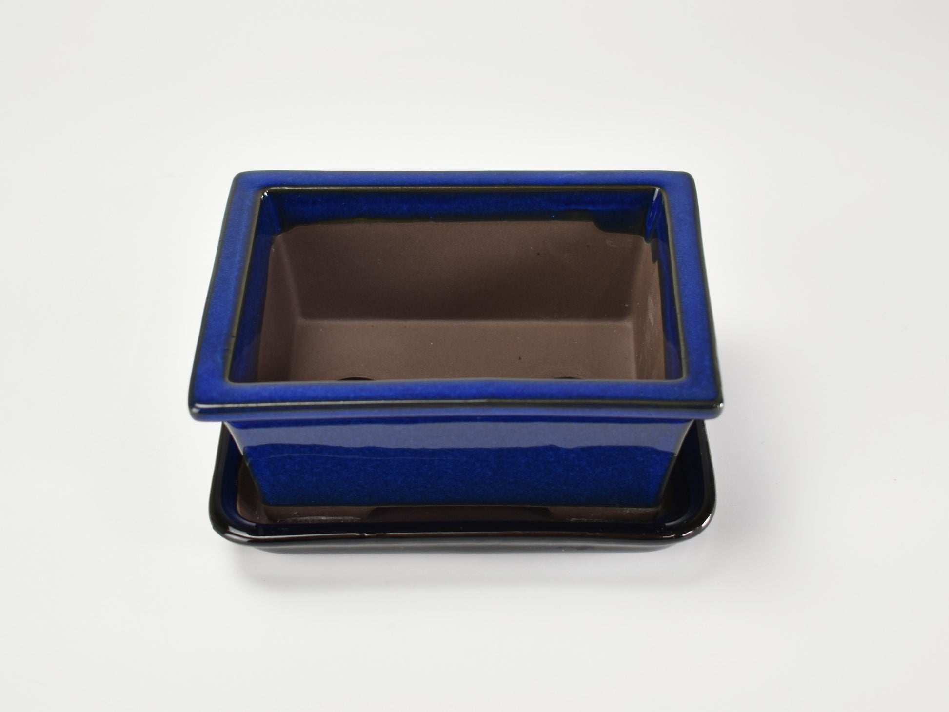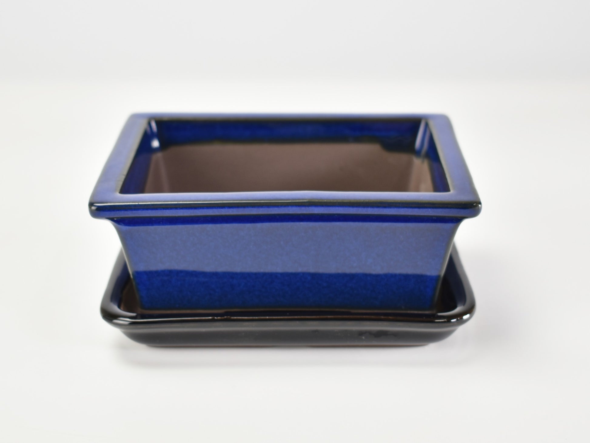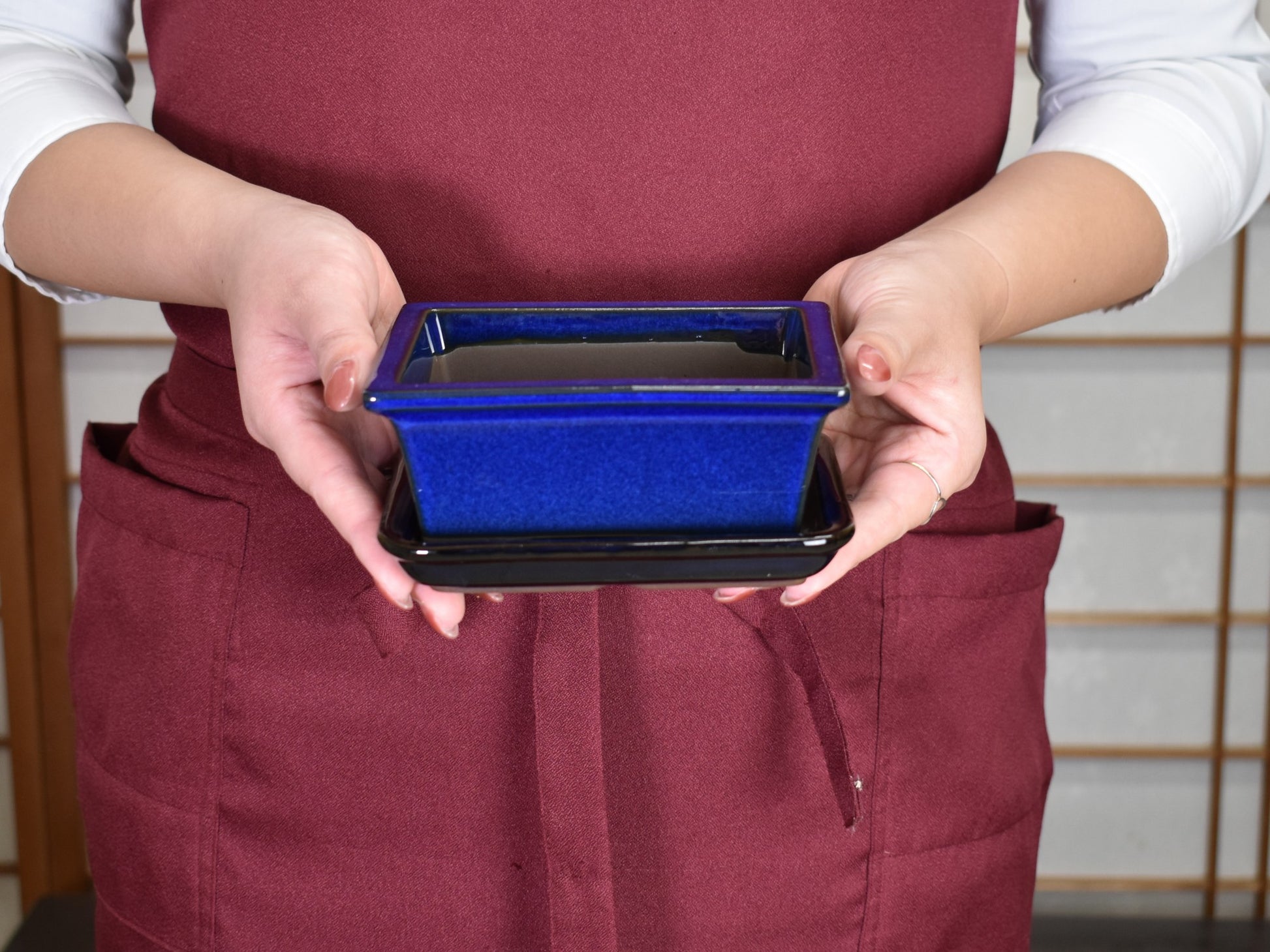 スタンダードな長角型の万古焼鉢です。深みのあるブルーの釉薬は、落ち着きと存在感があり盆栽の緑を引き立ててくれます。松などの定番樹種はもちろん、さまざまな樹に合わせやすく使い勝手の良い色です。つるりとした表面は汚れがついても拭き取りやすく、丈夫でお手入れも簡単。。初心者から上級者まで幅広くおすすめできる、定番でありながら飽きのこない一鉢です。