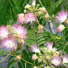 ネムノキは落葉高木で、枝は横に広がり夏には羽状複葉を広げて緑陰をつくります。葉は夕方になると閉じてその葉姿が眠りにつくように見えることから「ネムノキ」と名付けられました。開花時期の6から7月には、枝の先から淡い紅色の長い雄しべを持つ花がたくさん集まって繊細な姿で咲きます。