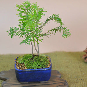 2つにわれた柔らかい葉をもつ涼し気な雰囲気のトドマツです。見た目から南国の植物のようですが、北海道に自生する寒さに強い松類です。成長が早く、大きいものはクリスマスツリーとしても使われますが、盆栽としてはめずらしい樹種です。