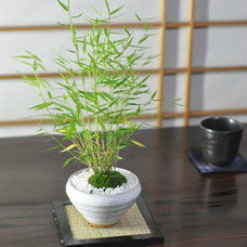 和の代表植物 竹です。小型で鉢植えや盆栽、苔玉に使え、丈夫で管理しやすいのではじめての方におすすめです。細い葉が涼しげで涼を楽しませてくれます。冬は地上部が枯れますが、春になればまた芽がでます。