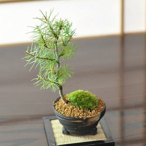 自生する針葉樹の中では唯一の落葉樹です。昔は高山地帯に天然分布していたのですが、植林が進んだ現在では全国各地でもみられるようになりました。春の芽出し淡緑、夏の濃緑の鮮やかさ、秋の黄葉もすばらしく、落葉後の寒樹は素朴さをかもしだしているので、四季折々の姿が楽しめる盆栽です。