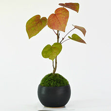 高さ3m程まで大きくなる落葉低木です。可愛らしい丸みを帯びたハート形の葉がつきます。今では自生種もほとんど見られなくなっているのでとても貴重な祖植物です。また、紅葉がとても美しい木で、一度に赤くなるのではなく、黄色く染まり徐々に赤に変わっていきます。また、暗赤色で星形の小さな花が葉の散り始めに咲くので紅葉と花を楽しむ事が出来ます。