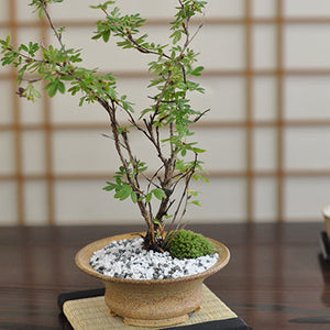 梅に似た小さな黄色の花が咲きます。長期に渡り次々と咲き続け、小花を全体に咲かせます。冷涼地では秋口まで開花を楽しむことができます。盆栽愛好家には良く知られている植物であり、海外でもたくさんの種類が栽培されています。海外からのものは品種名がなく野生種や個体別でキンロバイとして流通しています。生長がはやく剪定も簡単ですので高山の岩場に自生しているような雰囲気の盆栽がつくれます。